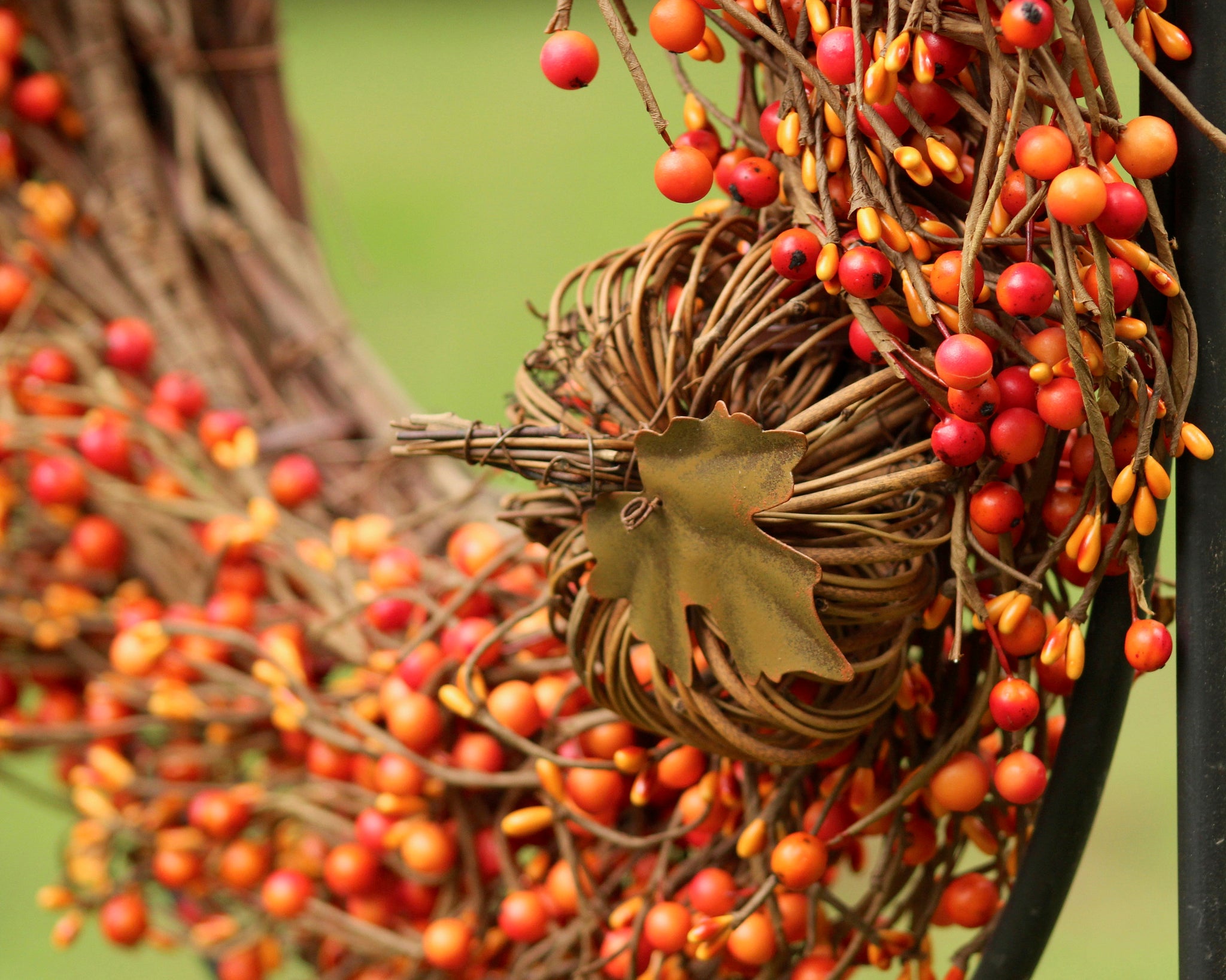Perfect for bringing a rustic feel to your home, this fall wreath is bursting with orange berries and an adorable grapevine pumpkin, backed by a sturdy grapevine base & topped with a bow in the color of your choice.