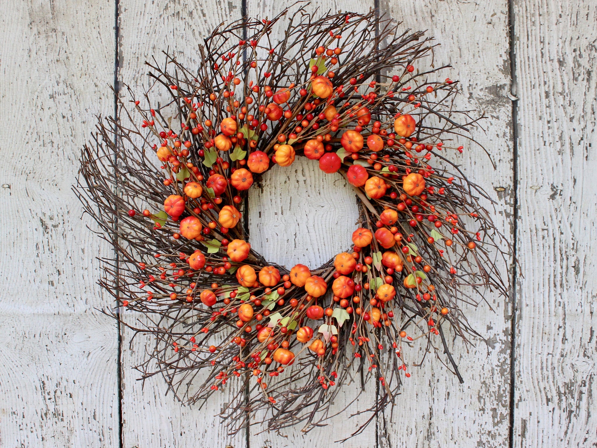 This primitive Halloween wreath will welcome your guests and visitors in style! Fall berries, pumpkins, and green leaves adorn this twig based wreath.